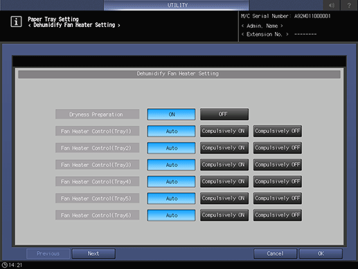 If Paper Feed Unit PF-707m or Paper Feed Unit PF-711 is equipped with Dehumidifier Heater HT-506, set the Dryness Preparation ON/OFF option and the automatic/compulsive fan heater ON/OFF option for each tray.