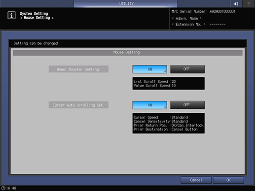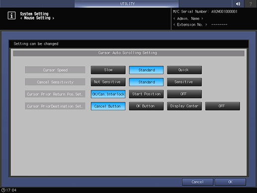 Cursor Auto Scrolling Setting: When selecting some items on Job Ticket Edit screen, another setting screen opens and the mouse cursor can be moved to the screen automatically. Specify the mouse behavior in detail.