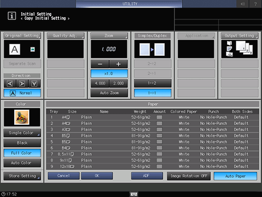 You can set the default settings for the COPY screen that are to be applied when the machine is reset. To enable this function, select Initialize for Reset Button Function in Job Reset Setting.