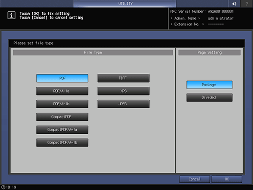 In the File Type item, select the desired file type, then press Package or Divided in Page Settings.