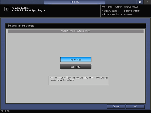 Select the tray to be prioritized as output tray for jobs which designate auto tray to output. Select either the main tray or sub tray.