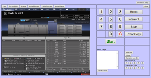 • Setting up the real-time remote panel enables the remote control using the screen updated in real time. As with the Remote Panel, the Real-time Remote Panel can prohibit operating the machine from the touch panel and control panel (Main Panel Lock). With this function activated, the touch panel of the main body turns off and you will not be able to check the operations performed on the Real-time Remote Panel.