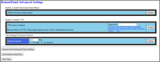 The Remote Panel Advanced Settings screen is provided to disable Real-time Remote Panel or to set the time for the session timeout.