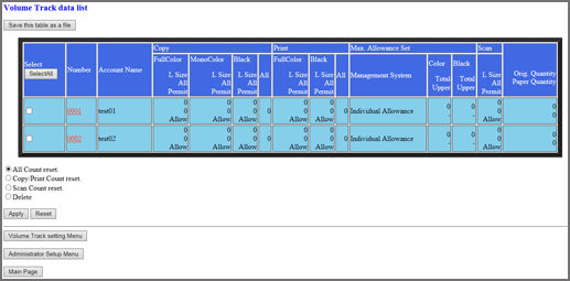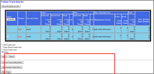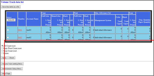 supplementary explanationClick on the check box(es) on the Volume Track data list screen to select the account track data of the counter to be cleared. Click on the radio button (a white circle) heading the desired reset mode.
