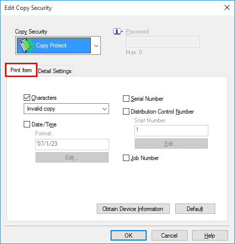 In the [Stamp/Composition] tab, select the [Copy Security] check box, and then select [Password Copy].